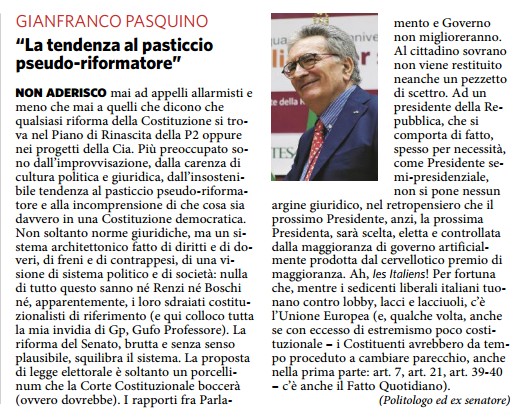 Non aderisco mai ad appelli allarmisti e meno che mai a quelli che dicono che qualsiasi riforma della Costituzione si trova nel Piano di Rinascita della P2 oppure nei progetti della Cia. Più preoccupato sono dall’improvvisazione, dalla carenza di cultura politica e giuridica, dall’insostenibile tendenza al pasticcio pseudo-riformatore e alla incomprensione di che cosa sia davvero in una Costituzione democratica. Non soltanto norme giuridiche, ma un sistema architettonico fatto di diritti e di doveri, di freni e di contrappesi, di una visione di sistema politico e di società: nulla di tutto questo sanno né Renzi né Boschi né, apparentemente, i loro sdraiati costituzionalisti di riferimento(e qui colloco tutta la mia invidia di Gp, Gufo Professore). La riforma del Senato, brutta e senza senso plausibile, squilibra il sistema. La proposta di legge elettorale è soltanto un porcellinum che la Corte Costituzionale boccerà(ovvero dovrebbe). I rapporti fra Parlamento e Governo non miglioreranno. Al cittadino sovrano non viene restituito neanche un pezzetto di scettro. Ad un presidente della Repubblica, che si comporta di fatto, spesso per necessità, come Presidente semi-presidenziale, non si pone nessun argine giuridico, nel retropensiero che il prossimo Presidente, anzi, la prossima Presidente, sarà scelta, eletta e controllata dalla maggioranza di governo artificialmente prodotta dal cervellotico premio di maggioranza. Ah, les Italiens! Per fortuna che, mentre i sedicenti liberali italiani tuonano contro lobby, lacci e lacciuoli, c’è l’Unione Europea (e, qualche volta, anche se con eccesso di estremismo poco costituzionale – i Costituenti avrebbero da tempo proceduto a cambiare parecchio, anche nella prima parte: art. 7, art. 21, art. 39-40 – c’è anche il Fatto Quotidiano).