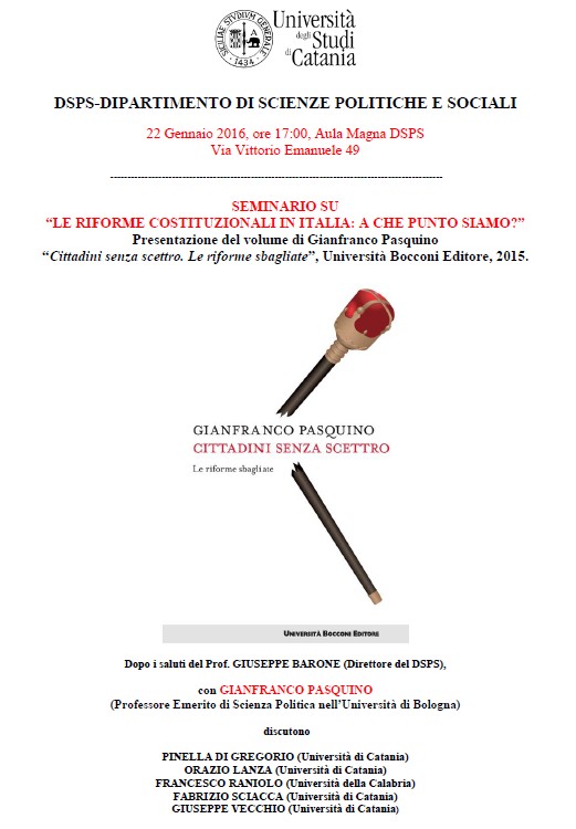 Venerdì 22 gennaio alle 17, nell’aula magna di Palazzo Pedagaggi (via Vittorio Emanuele II, 49), il dipartimento di Scienze politiche e sociali organizza il seminario dal titolo “Le riforme costituzionali in Italia: a che punto siamo?“.