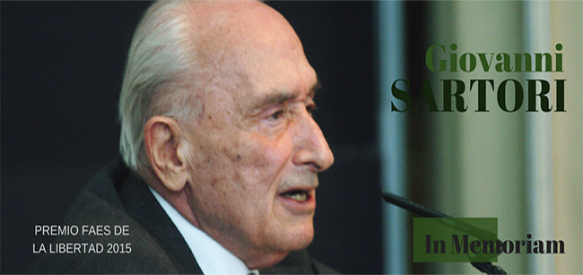 El politólogo italiano más grande, Giovanni Sartori, ha muerto en Roma un mes antes de su 93 cumpleaños. Autor de libros fundamentales como Democrazia e definizioni (1957), reelaborado en diferentes versiones hasta The Theory of Democracy Revisited (1987, en dos volúmenes), Parties and party systems (1976) y Comparative Constitutional Engineering (1994), Sartori sentía un particular cariño por Homo Videns (1997). Entre las numerosas distinciones ad honorem que recibió está el prestigioso premio a toda su carrera de la International Political Science Association (2009). Sartori estaba muy orgulloso de haber recibido el Premio Príncipe de Asturias a las Ciencias Sociales. También fue Premio FAES de la Libertad 2015. A él se debe la (re)construcción de la ciencia política en Italia. En 1967 dio vida al Centro de Estudios de Política Comparada en Florencia y después fundó la Revista Italiana de Ciencia Política, de la que fue el redactor jefe los primeros siete años y después codirector de 2001 a 2004. Gracias a su empeño personal, la ciencia política entró a formar parte de las Facultades de Ciencia Política italianas como materia de estudio diferenciada. En 1979 le fue ofrecida la prestigiosa cátedra Albert Schweitzer Chair de Humanidades en la Universidad de Columbia, donde permaneció hasta 1995, año en el que se convirtió en profesor emérito.