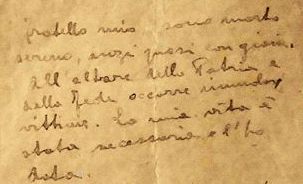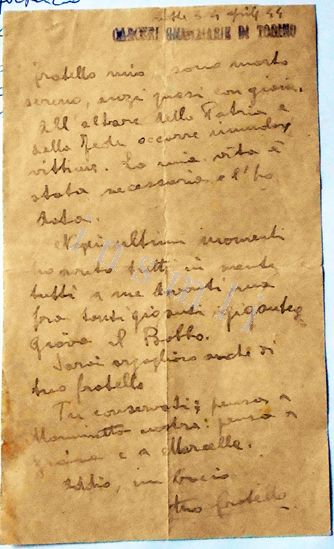 L’immagine riproduce l’ultima lettera scritta da Paolo Braccini al fratello Fabio. Il documento è vergato su un foglietto con il timbro delle “Carceri giudiziarie di Torino”