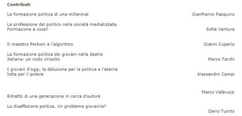 Interrogarsi sui giovani è, logicamente e inevitabilmente, interrogarsi sul futuro: sul loro, ma anche su quello che rimane del nostro. È cercare di capire che cosa diventerà l’Italia e che cosa ne sarà dell’Europa. È cercare di capire quali modelli hanno i giovani, quali prospettive perseguono, quali valori ispirano i loro comportamenti. Gli articoli di questo fascicolo cercano in particolare di capire, dall’angolo visuale della “formazione”, come i giovani, spesso criticati per le loro mancanze e il loro distacco, si rapportano alla politica. Come vi sono arrivati, se vi pervengono effettivamente, quali novità è possibile riscontrare nel loro percorso, se tale può essere definito il tragitto attraverso il quale acquisiscono la consapevolezza che la politica conta per loro anche contro di loro, le loro preferenze, la loro disponibilità, se qualcosa si è rotto nella trasmissione di interesse e di informazione dalle “vecchie” generazioni a quelle attuali.