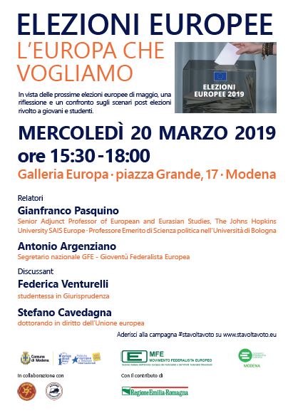 Galleria Europa · piazza Grande, 17 · ModenaIn vista delle prossime elezioni europee di maggio, una riflessione e un confronto sugli scenari post elezioni rivolto a giovani e studenti.