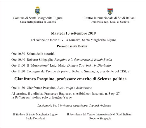 L’Università di Genova, con il Centro Internazionale di Studi Italiani presieduto dal prof. Roberto Sinigaglia, conferisce il Premio Isaiah Berlin per l’edizione 2019 a Gianfranco Pasquino, professore emerito di Scienza politica.