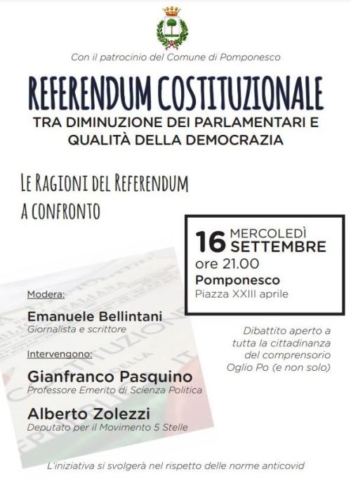 Home » Uncategorized » INVITO Tra diminuzione dei parlamentari e qualità della democrazia. Le Ragioni del Referendum a confronto #16settembre #Pomponesco #Mantova #Referendum2020