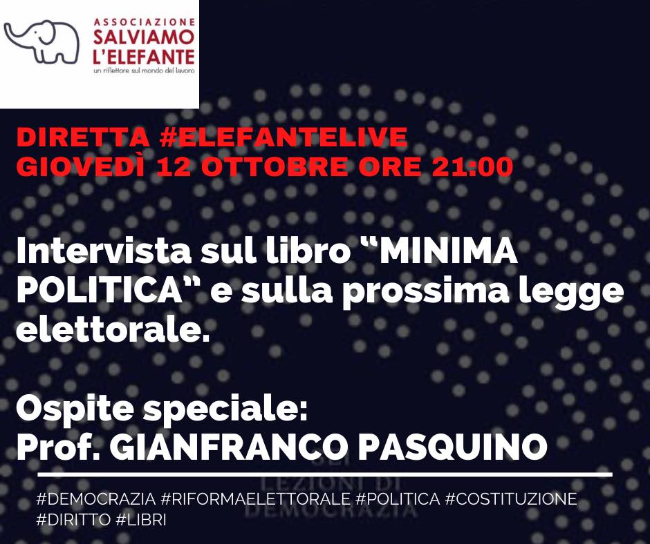 Ospite speciale dell’Associazione Salviamo l’Elefante il Prof. GIANFRANCO PASQUINO, politologo e accademico italiano, allievo di Norberto Bobbio e Giovanni Sartori, è professore emerito di Scienza politica all’Università di Bologna, nonché membro del gruppo di studio e di ricerca “Giustizia penale italiana, europea e internazionale” dell’Iberojur. Dal luglio 2005 è socio dell’Accademia dei Lincei. Ci parlerà del suo libro “MINIMA POLITICA Sei lezioni di democrazia” ed affronteremo con lui il dibattito riguardante la prossima legge elettorale.