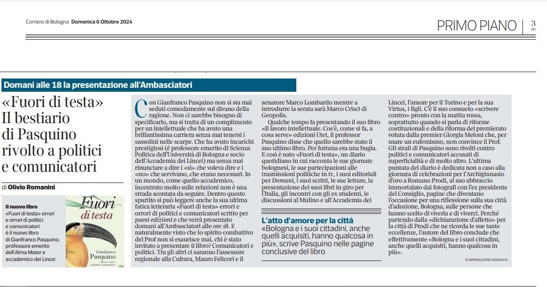 Qualche tempo fa presentando il suo libro «Il lavoro intellettuale. Cos’è, come si fa, a cosa serve» edizioni Utet, il professor Pasquino disse che quello sarebbe stato il suo ultimo libro. Per fortuna era una bugia. E così è nato «Fuori di testa», un diario quotidiano in cui racconta le sue giornate bolognesi, le sue partecipazioni alle trasmissioni politiche in tv, i suoi editoriali per Domani, i suoi scritti, le sue letture, la presentazione dei suoi libri in giro per l’Italia, gli incontri con gli ex studenti, le discussioni al Mulino e all’Accademia dei Lincei, l’amore per il Torino e per la sua Virtus, i figli. C’è il suo consueto «scrivere contro» pronto con la matita rossa, soprattutto quando si parla di riforme costituzionali e della riforma del premierato voluta dalla premier Giorgia Meloni che, per usare un eufemismo, non convince il Prof. Gli strali di Pasquino sono rivolti contro politici e comunicatori accusati di superficialità e di molto altro. L’ultima puntata del diario è dedicata non a caso alla giornata di celebrazioni per l’Archiginnasio d’oro a Romano Prodi, al suo abbraccio immortalato dai fotografi con l’ex presidente del Consiglio, pagine che diventano l’occasione per una riflessione sulla sua città d’adozione, Bologna, sulle persone che hanno scelto di viverla e di viverci. Perché partendo dalla «dichiarazione d’affetto» per la città di Prodi che ne ricorda le sue tante eccellenze, l’autore del libro conclude che effettivamente «Bologna e i suoi cittadini, anche quelli acquisiti, hanno qualcosa in più».