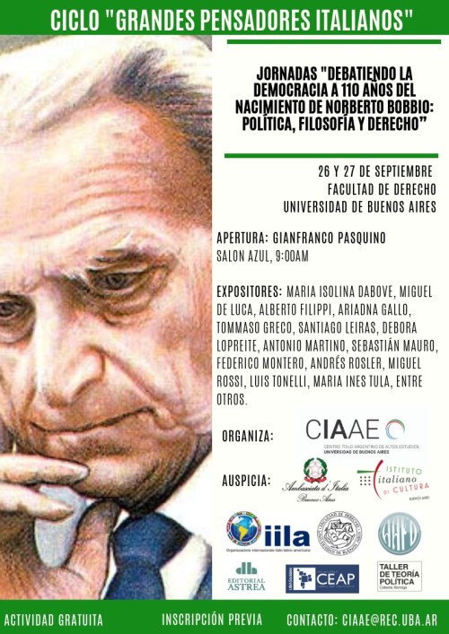 El Centro Italo Argentino de Altos Estudios (CIAAE) invita a las Jornadas “𝐃𝐞𝐛𝐚𝐭𝐢𝐞𝐧𝐝𝐨 𝐥𝐚 𝐝𝐞𝐦𝐨𝐜𝐫𝐚𝐜𝐢𝐚 𝐚 𝟏𝟏𝟎 𝐚ñ𝐨𝐬 𝐝𝐞𝐥 𝐧𝐚𝐜𝐢𝐦𝐢𝐞𝐧𝐭𝐨 𝐝𝐞 𝐍𝐨𝐫𝐛𝐞𝐫𝐭𝐨 𝐁𝐨𝐛𝐛𝐢𝐨: 𝐩𝐨𝐥í𝐭𝐢𝐜𝐚, 𝐟𝐢𝐥𝐨𝐬𝐨𝐟í𝐚 𝐲 𝐝𝐞𝐫𝐞𝐜𝐡𝐨” que que se desarrollarán los días 𝟐𝟔 𝐲 𝟐𝟕 𝐝𝐞 𝐬𝐞𝐩𝐭𝐢𝐞𝐦𝐛𝐫𝐞 en la Facultad de Derecho de la Universidad de Buenos Aires (Salón Azul e Instituto Gioja).
