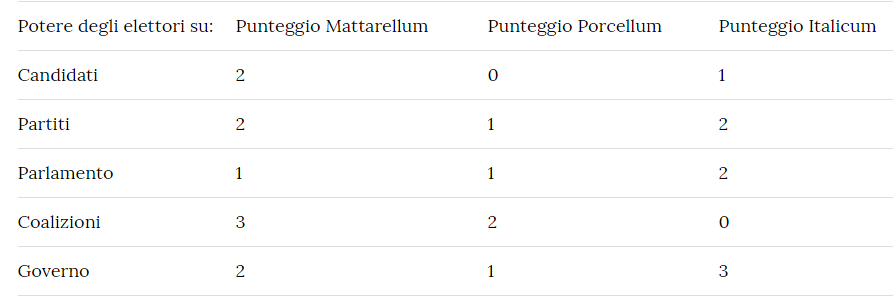 Tenendo a mente questi cinque elementi (scelta dei candidati, voto ai singoli partiti, elezione dei parlamentari, indicazione delle coalizioni, formazione del governo), è possibile costruire un indice che misuri il potere elettorale complessivo dei cittadini. A ciascun elemento sarà assegnato un punteggio che va da 0 (nullo) a 3 (massimo), con punteggi intermedi che indicano un potere ridotto (1) o medio (2). L’indice di “potere degli elettori” andrà, dunque, da 0 (nessun potere agli elettori) a 15 (massimo potere elettorale).