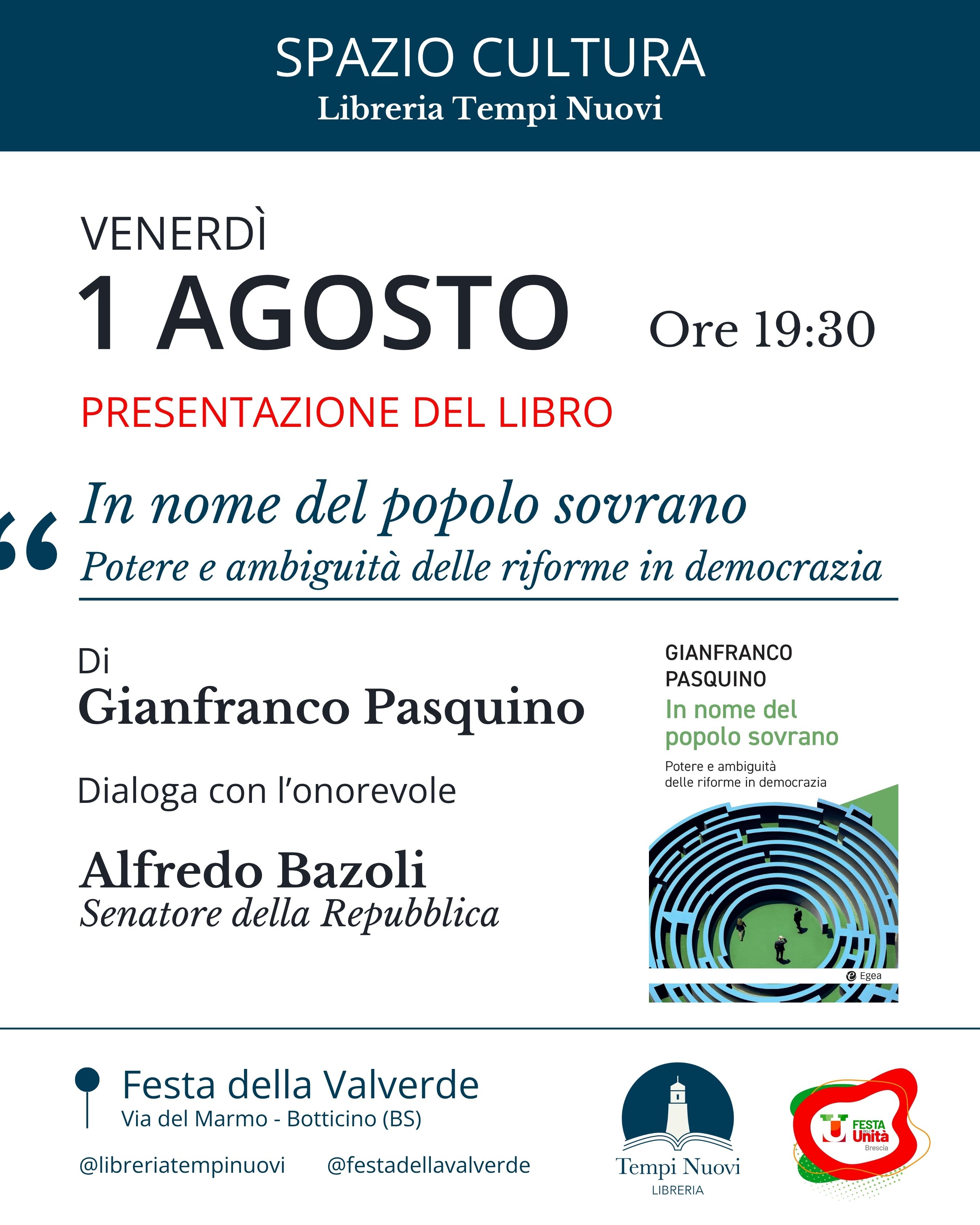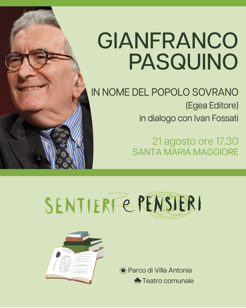 Fare riforme istituzionali è un compito importante, può migliorare la vita del popolo sovrano. Ma Gianfranco Pasquino porta il lettore davanti ad una limpida e documentata valutazione: finora gli improvvisati e imperterriti riformatori italiani non hanno dato buona prova. Da “In nome del popolo sovrano” (Egea Editore) prenderà vita un incontro importante, per cittadini che desiderano ancora interessarsi alla politica, essere informati, partecipanti ed europeisti: Gianfranco Pasquino, Senatore della Repubblica per tre legislature, Professore emerito di Scienza Politica nell’Università di Bologna e Socio dell’Accademia dei Lincei, ha dato alle stampe numerosi volumi e attualmente è editorialista del quotidiano Domani. A dialogare con l’autore sarà Ivan Fossati, capo della redazione de La Stampa di Verbania, media partner del Festival