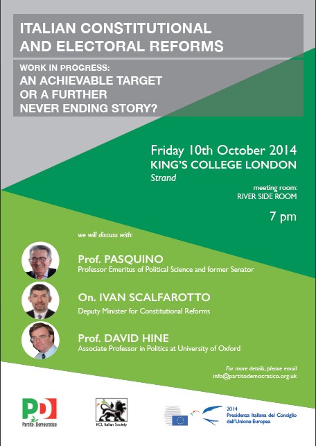 Il PD di Londra ha organizzato una Tavola Rotonda il 10 Ottobre durante la quale i nostri invitati Prof. Gianfranco Pasquino, Senatore Felice Casson, Onorevole Ivan Scalfarotto con la moderazione del Professor David Hine presenteranno le riforme esprimendo le loro posizioni, e le compareranno con altri sistemi bicamerali europei.