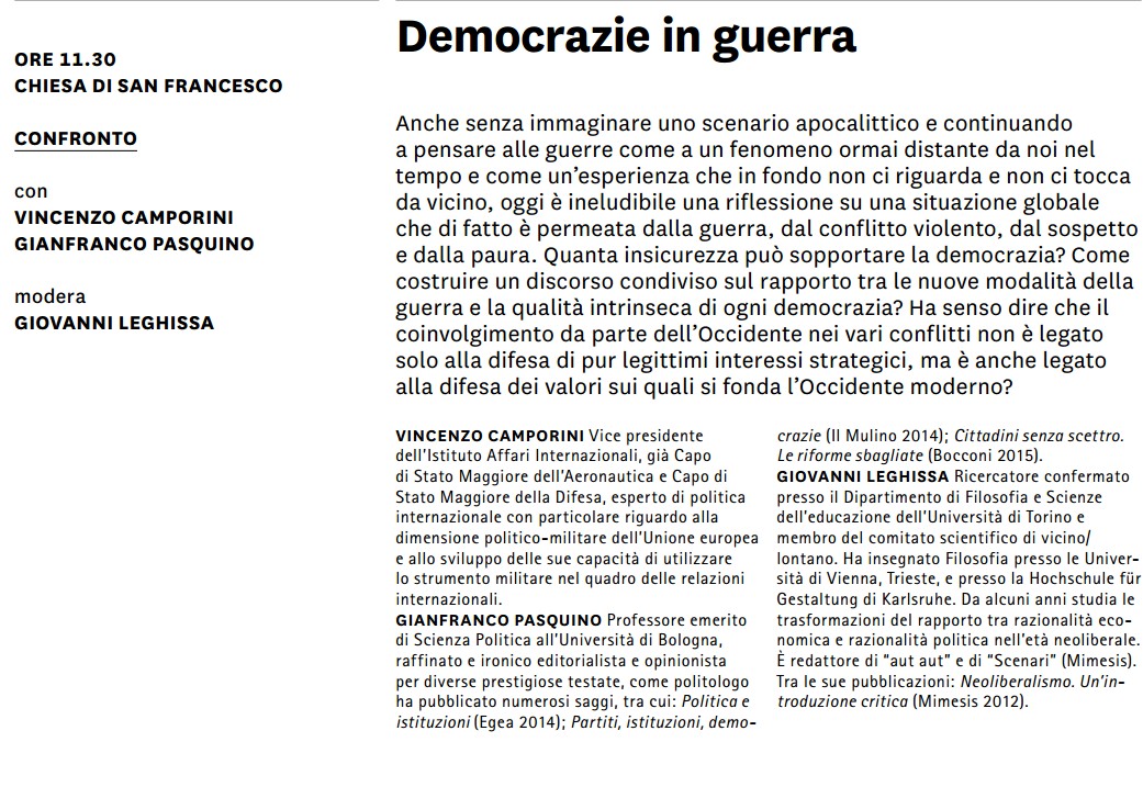 Anche senza immaginare uno scenario apocalittico e continuando a pensare alla guerra in forma tradizionale come a un fenomeno ormai distante da noi nel tempo e che in fondo non ci riguarda e non ci tocca da vicino, oggi è ineludibile una riflessione su una situazione globale che di fatto è permeata dalla guerra, dal conflitto violento, dal sospetto e dalla paura. Quanta insicurezza può sopportare la democrazia? Come costruire un discorso condiviso sul rapporto tra le nuove modalità della guerra e la qualità intrinseca di ogni democrazia? Ha senso dire che il coinvolgimento da parte dell’Occidente nei vari conflitti non è legato solo alla difesa di interessi strategici, ma è anche legato alla difesa dei valori sui quali si fonda l’Occidente moderno?