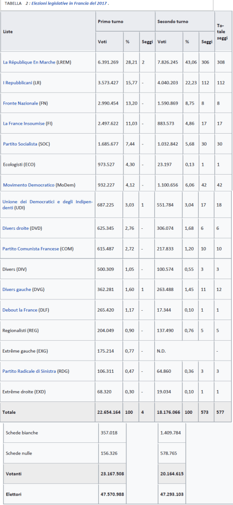Come dimostrano i dati della tabella relativa alle più recenti elezioni legislative, quelle del 2017, nell’Assemblea Nazionale francese sono presenti rappresentanti di addirittura otto partiti che hanno dato vita a sette gruppi parlamentari.