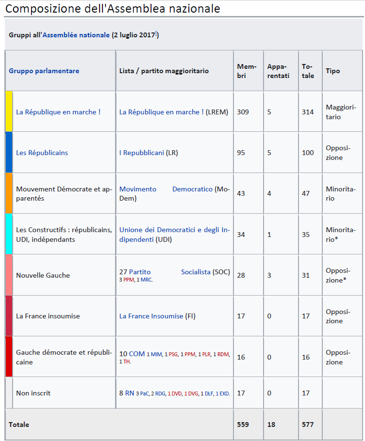 Come dimostrano i dati della tabella relativa alle più recenti elezioni legislative, quelle del 2017, nell’Assemblea Nazionale francese sono presenti rappresentanti di addirittura otto partiti che hanno dato vita a sette gruppi parlamentari.