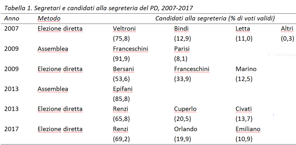 Tabella 1. Segretari e candidati alla segreteria del PD, 2007-2017