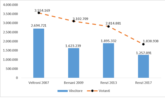 Prigionieri della retorica renziana troppi commentatori (nonché, naturalmente, i pappagalleschi collaboratori del segretario) insistono sui due milioni di voti conquistati da Renzi in quelle che loro chiamano “primarie”, ma che sono semplicemente state le votazioni per il segretario. Da ultimo, ma non mancheranno i “ripetitori”, senza nessuna remora, Francesco Verderami scrive, attribuendo le parole a Franceschini, che le regole (della necessaria politica delle coalizioni) non sono mutate “[ne]anche per chi ha ottenuto due milioni di voti alle primarie” (Franceschini e il duello sulle alleanze, Corriere della sera”, 8 luglio 2017, p. 9). Ecco, l’ultimo ad avere ottenuto più di due milioni di voti nella sua elezione a segretario, è stato Walter Veltroni, dieci anni fa. Poi, come mostra il grafico, con partecipazione chiaramente declinante, né Bersani né i “due” Renzi sono arrivati a quella cifra.