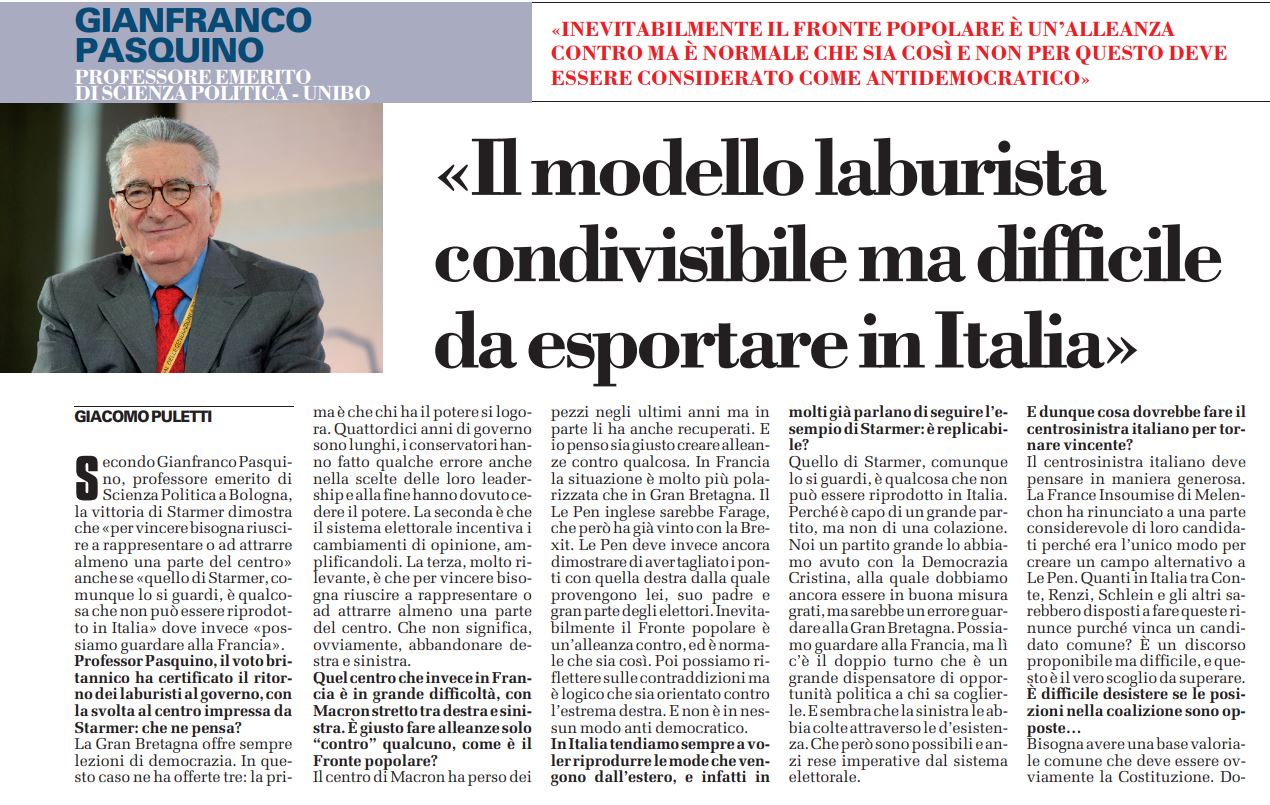 Secondo Gianfranco Pasquino, professore emerito di Scienza Politica a Bologna, la vittoria di Starmer dimostra che «per vincere bisogna riuscire a rappresentare o ad attrarre almeno una parte del centro» anche se «quello di Starmer, comunque lo si guardi, è qualcosa che non può essere riprodotto in Italia» dove invece «possiamo guardare alla Francia».