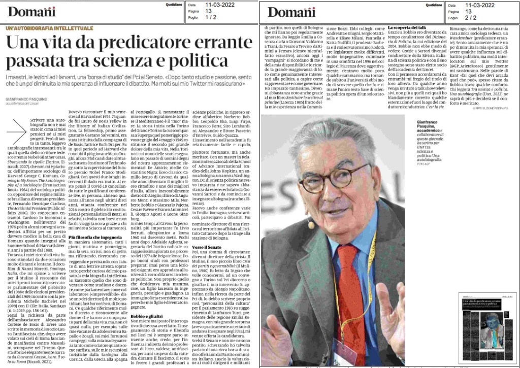 Sono molto affezionato ad alcuni libri che ho scritto, ad esempio, Libertà inutile. Profilo ideologico dell’Italia repubblicana (2021) e Tra scienza e politica. Una autobiografia (2022) oltre che alle lezioni e conferenze di Scienza politica che ho tenuto in Italia e fuori. Vorrei scrivere un’analisi comparata delle democrazie, ma con grande tristezza sento che mi manca l’energia.