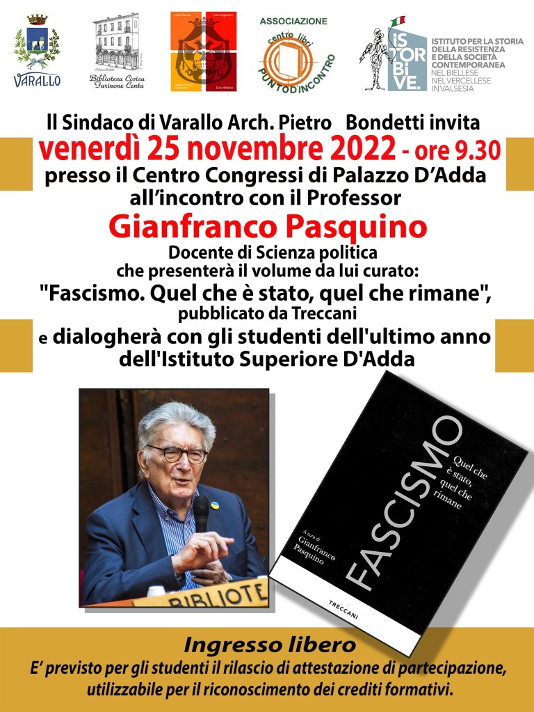 Venerdì 25 novembre, alle 9.30, sarà Ospite a Varallo presso il Centro Congressi di Palazzo D’Adda, il Professor Gianfranco Pasquino, Professore Emerito di Scienza politica, accademico dei Lincei, Senatore della Repubblica dal 1983 al 1992 e dal 1994 al 1996, editorialista del quotidiano Domani, nel passato de Il Sole 24 Ore, la Repubblica e l’Unità, già commentatore della trasmissione radiofonica di Radio 1 Zapping, per incontrare gli studenti dell’ultimo anno delle Istituto Superiore D’Adda, in un incontro aperto anche a tutti coloro che fossero interessati.
