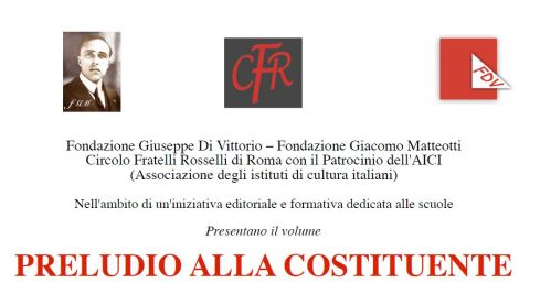Nell’ambito di un’iniziativa editoriale e formativa dedicata alle scuole, la Fondazione Giuseppe Di Vittorio, la Fondazione Giacomo Matteotti, il Circolo Fratelli Rosselli di Roma con il Patrocinio dell’AICI (Associazione delle Istituzioni di cultura italiane), hanno presentato il volume, “Preludio alla Costituente”, cura e introduzione di Alberto Aghemo, Giuseppe Amari, Blando Palmieri, prefazione di Valdo Spini, Postfazione di Giuliano Amato. La presentazione si è svolta mercoledì 5 dicembre 2018 presso la Camera dei Deputati, Sala della Lupa. Sono intervenuti insieme ai curatori, Flavia Nardelli, Gianfranco Pasquino, Cesare Pinelli, Alessandro Roncaglia, Valdo Spini, Livia Turco, Lucio Villari.