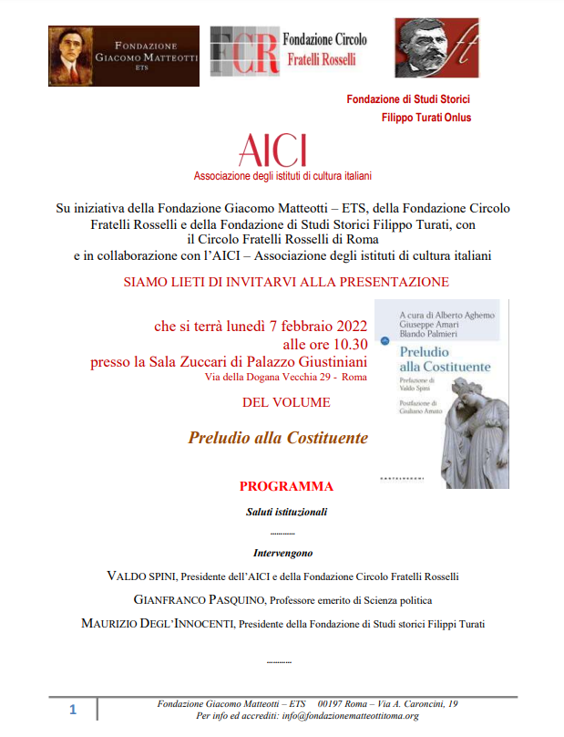 Su iniziativa della Fondazione Giacomo Matteotti – ETS, della Fondazione Circolo Fratelli Rosselli e della Fondazione di Studi Storici Filippo Turati, con il Circolo Fratelli Rosselli di Roma e in collaborazione con l’AICI – Associazione degli istituti di cultura italiani